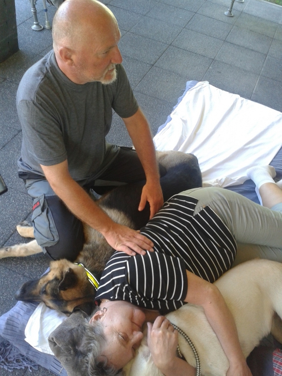 Zároveň ukladá jednu z klientiek medzi dvoch psov, ktorých telesná teplota je vyššia ako ľudská, čiže dokážu ľuďom odovzdávaním svojho tepla zlepšiť zdravotný stav prehriatím postihnutých tkanív a zvieracím rýchlym dýchaním dochádza k jemnému masírovaniu a uvoľňovaniu svalstva človeka.